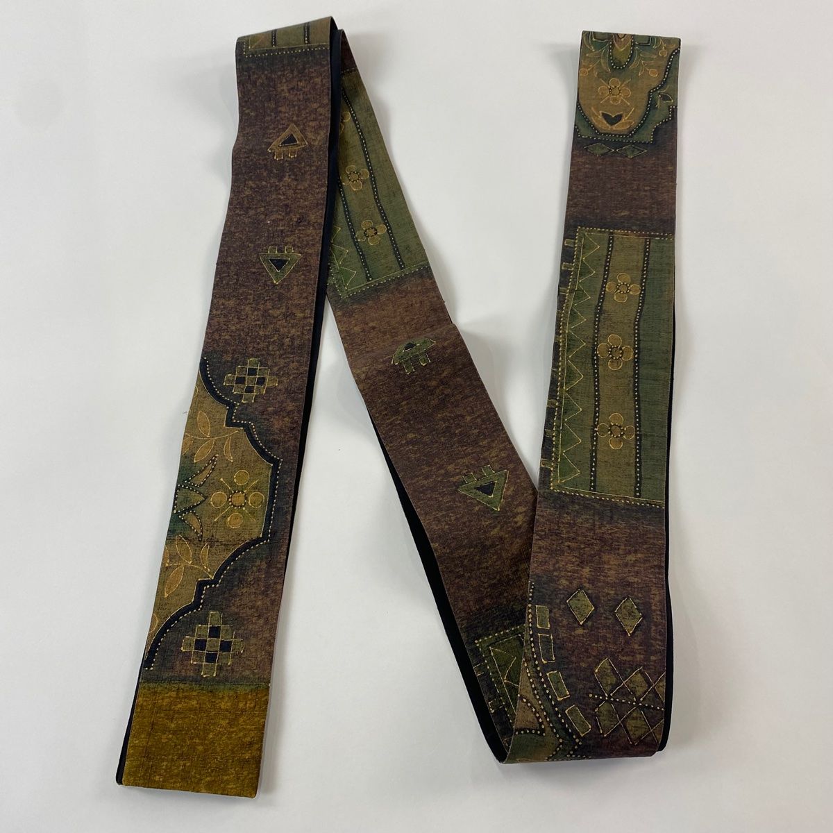 角帯 秀品 紬地 花 幾何学模様 金彩 茶緑色 正絹