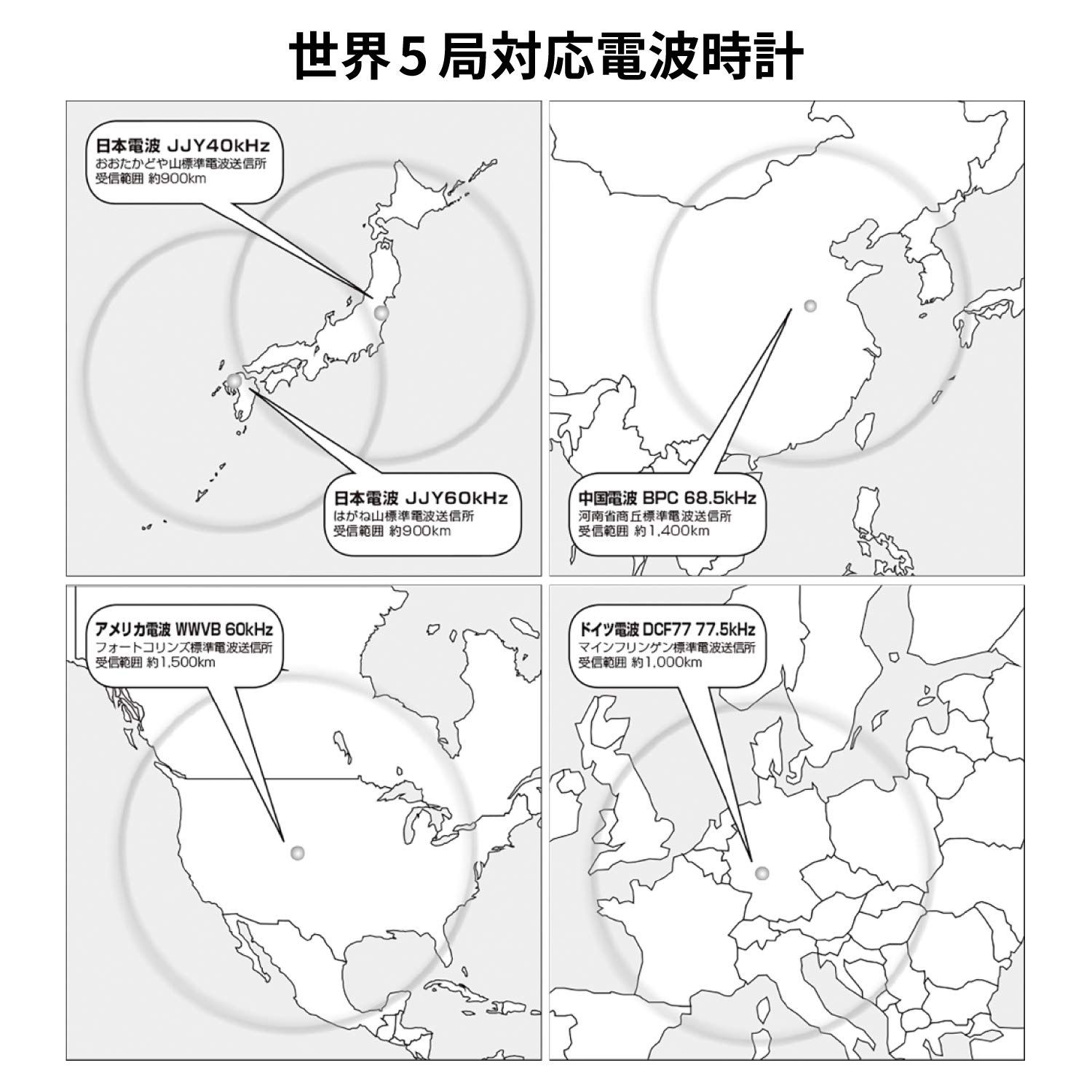 日本2局・中国・ドイツ・アメリカと5局の電波を受信し正確な時刻を表示する世界仕様の電波時計です。ソーラー電源機能により定期的な電池交換が不要になりエコかつ経済的に長く使えます。