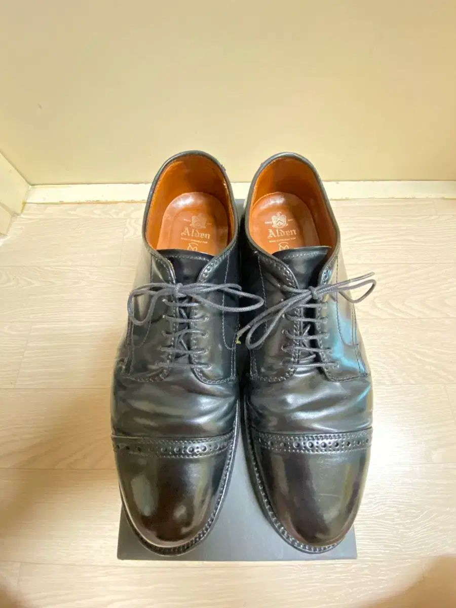 これはオールデンサンマビョルジュ A7503 コードバンブラッククォーターブローグキャプトダービーです。見ての通り全体的に状態は良好です。ほのかな光沢感のあるブラックカラーは高級感があります。他に質問がない場合は、すぐに安全な支払いを行ってください!