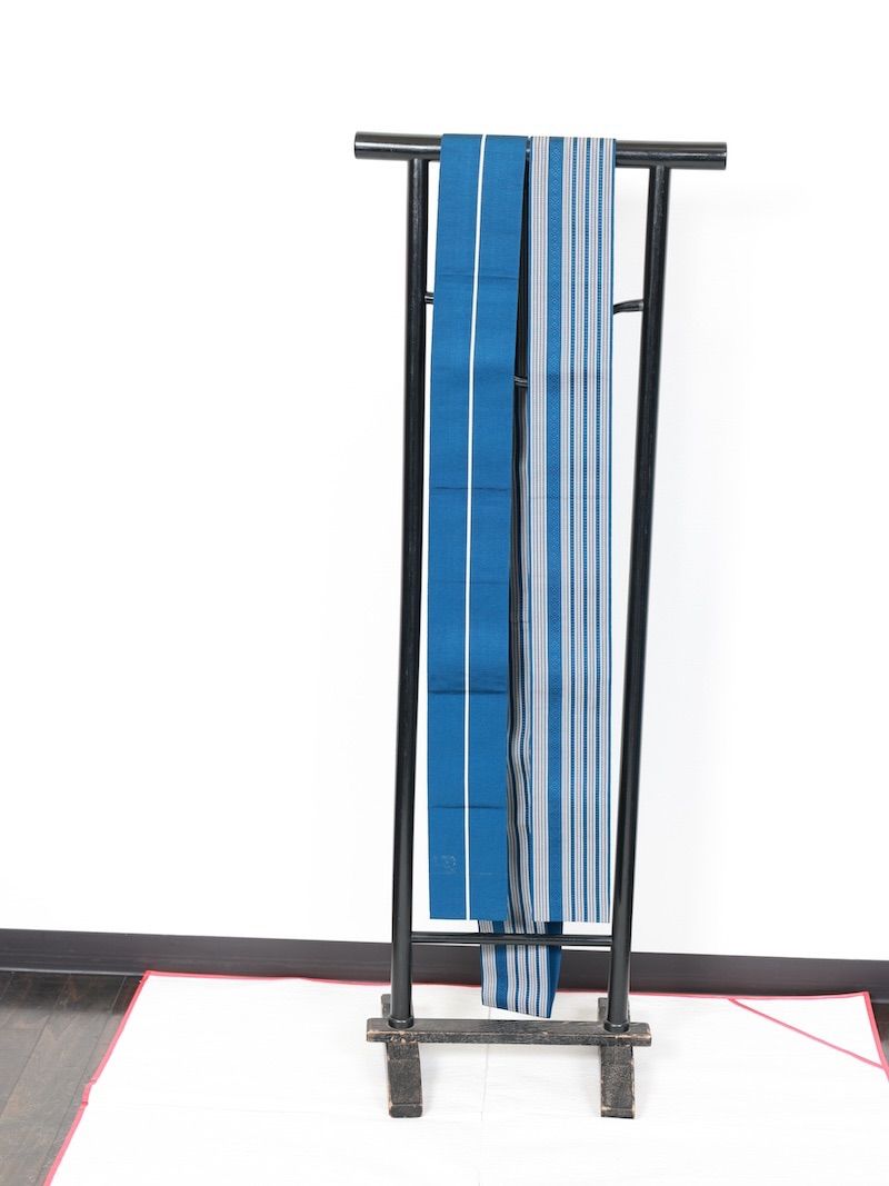 スッキリした藍濃淡に白で献上柄を織り上げた素敵なお品をオシャレに締めてお出かけください。