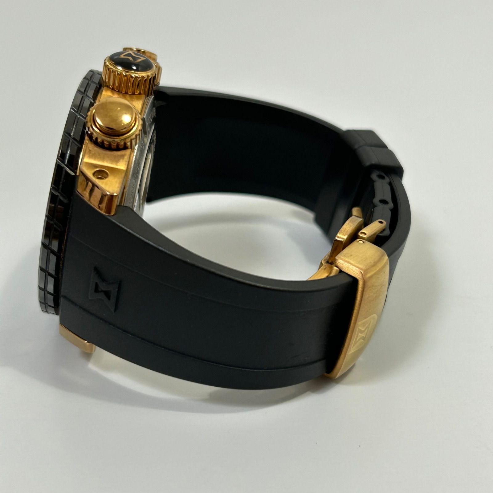ゴールドでコーティングされた男らしい無骨さとエレガントさを合わせもつデザイン性に優れた腕時計です。300m防水を備えており実用性も申し分ありません。