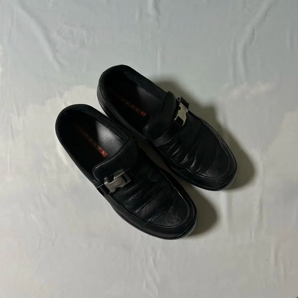 これらはプラダのローファーです。スポーティーな靴底とバックルのディテールが魅力的な商品です。