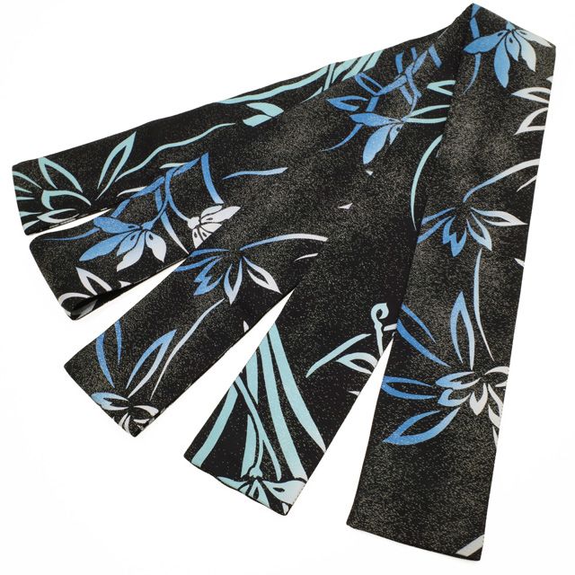なめらかな手触りの黒の銀通し地に、ブルーのグラデーションでお洒落な蘭の柄行が手染めされたデザインです。