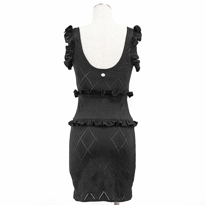 CHANEL シャネル ワンピース ニット P 71339 2021 PreFall COCOマーク ロゴ チャーム ダイヤ柄 幾何学模様 ジャガード 伸縮性 フリル ノースリーブ プルオーバー ボディコン ドレス レディース 36 ブラック 黒 伊製
