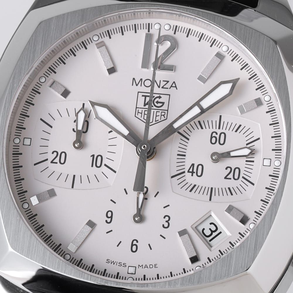 ■モデル情報:1930年代にホイヤーが製作していたレーシングウォッチを復刻したもので、オリジナルは手巻き式の2カウンター仕様でしたが、CR2114-0では3カウンターの自動巻きに進化しています。独特のクッション型ケースが特徴で、クラシカルな雰囲気を持ちながらも、現代的なサイズ感と機能性を備えたタグホイヤーの歴史とレーシングスピリットを感じられる1本です。