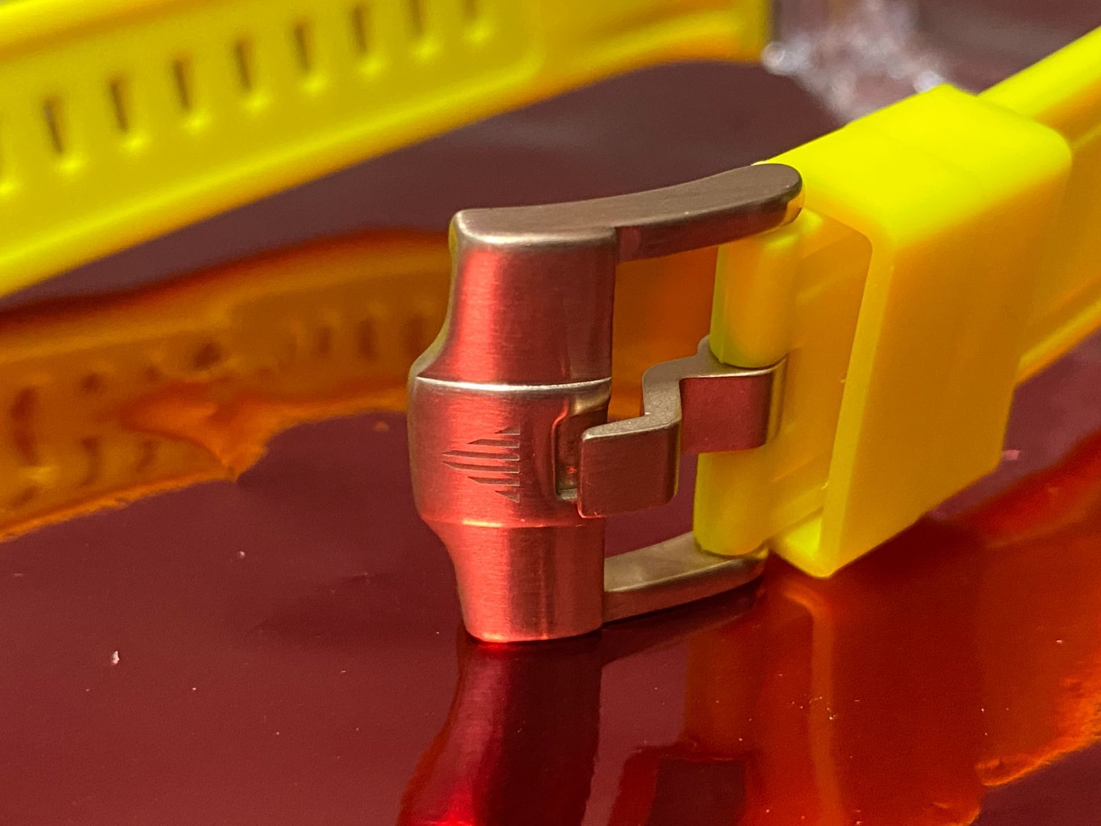 ダイヤルにはワンポイントジルコニアが装飾され、ラバーは柔らかくバックルはダイヤモンドメタルカット。