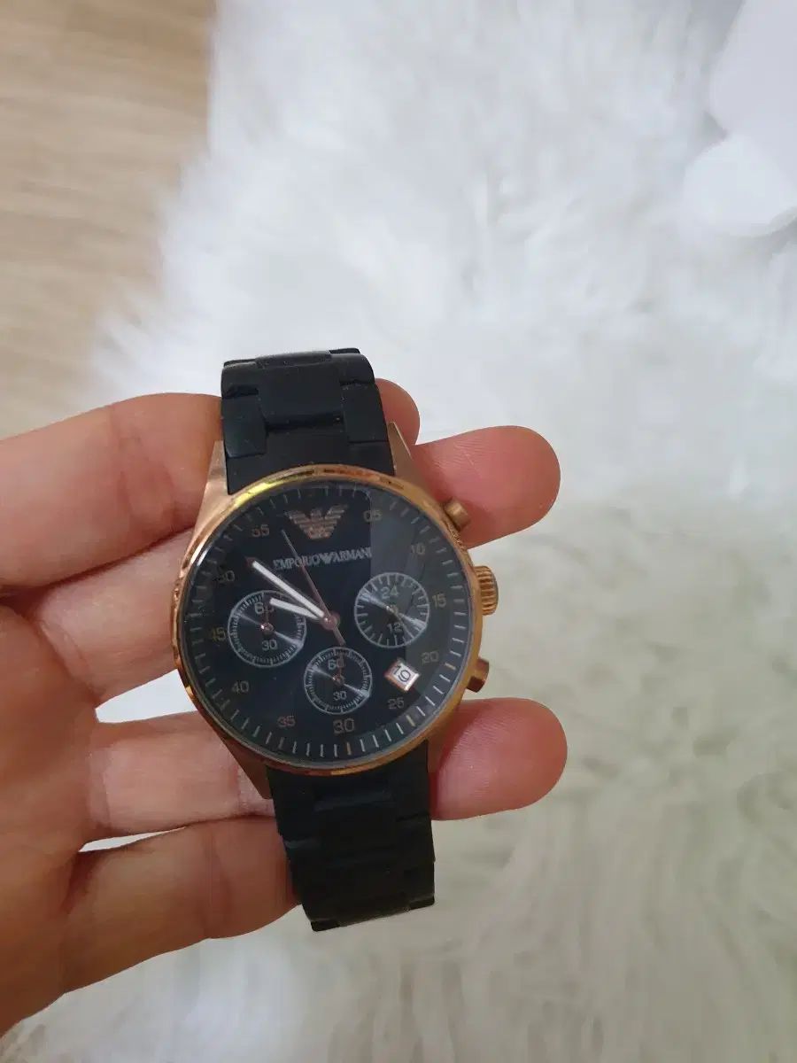 男性用エンポリオアルマーニブラックメタルウォッチ。ブラックのメタルバンドとローズゴールドカラーの組み合わせは豪華です。日付表示機能もあります。ご不明な点がなければ、すぐに安心してお支払いいただけます!
