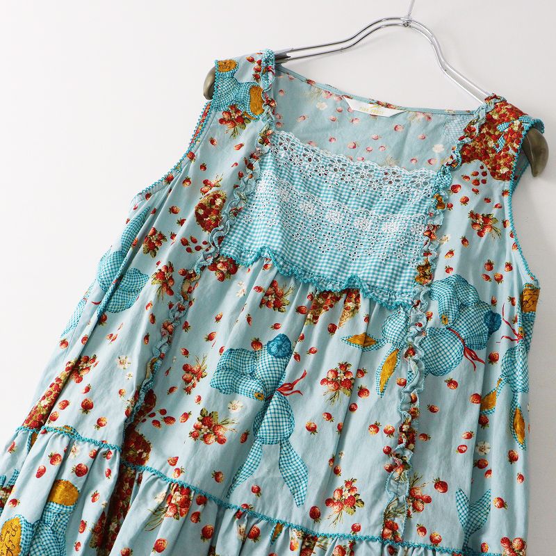 2025 ピンクハウス PINK HOUSE ギンガムうさぎプリントノースリーブワンピース ライトブルー ピコフリル ドレス