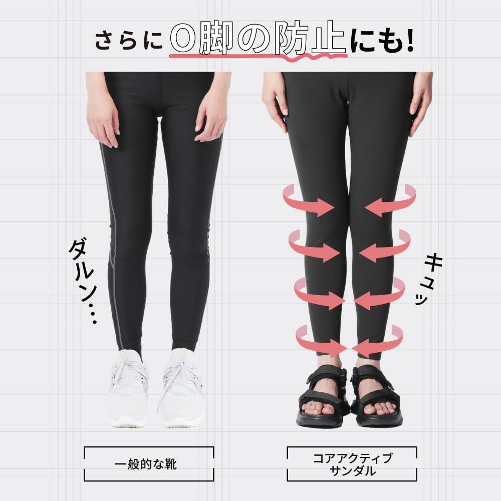 コアアクティブサンダルは独自のインソールで重心をコントロールし、体幹を刺激します。アウトソールも体幹歩行をサポートし、モデルのように歩行がきれいに!足に優しくフィットするソフトアッパー素材で快適な履き心地をストレスフリー設計。