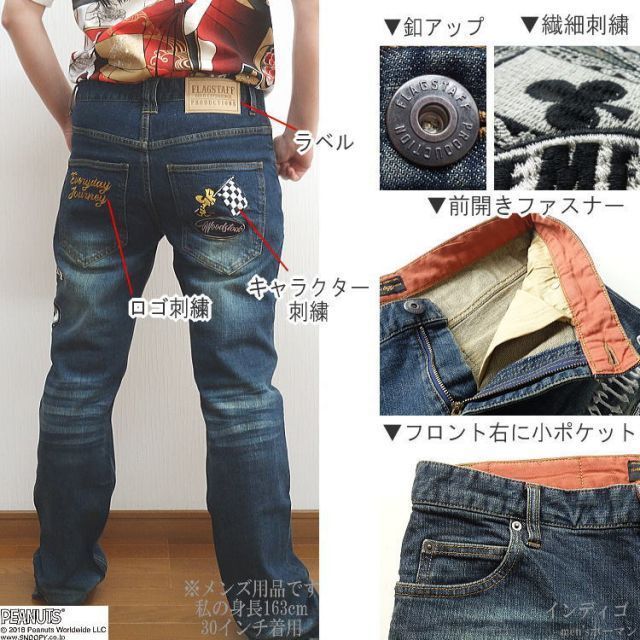 商品名:2022年夏新作【ビッグ有】FLAGSTAFF×スヌーピーコラボ【送料無料】SNOOPY刺繍 ウッドストック バイク PEANUTS ローライズストレッチデニム ジーンズ インディゴ 30〜40【smtb-k】【ky】【YDKG-k】メンズ 422230
