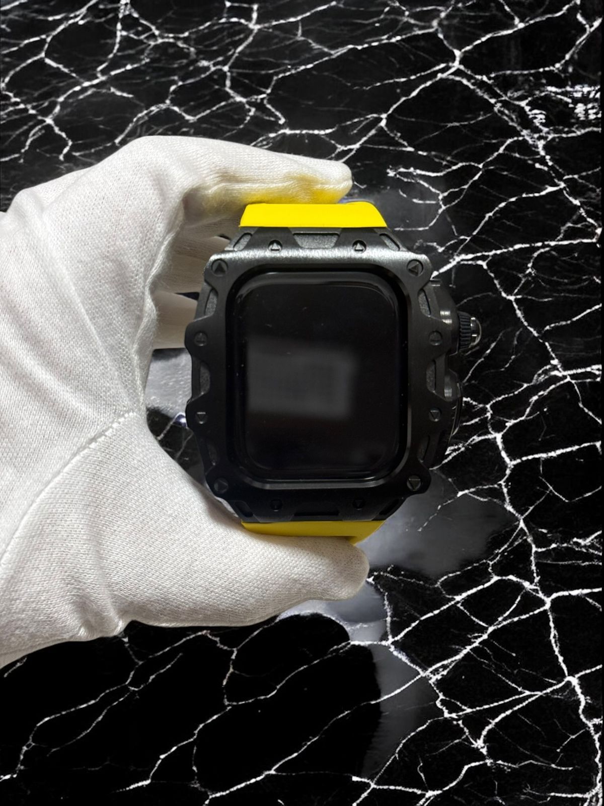 精巧なデザインと無骨なフォルムが特徴のケース。Apple Watchを強固に守りながら、高級感とタフさを兼ね備えた仕上がり。